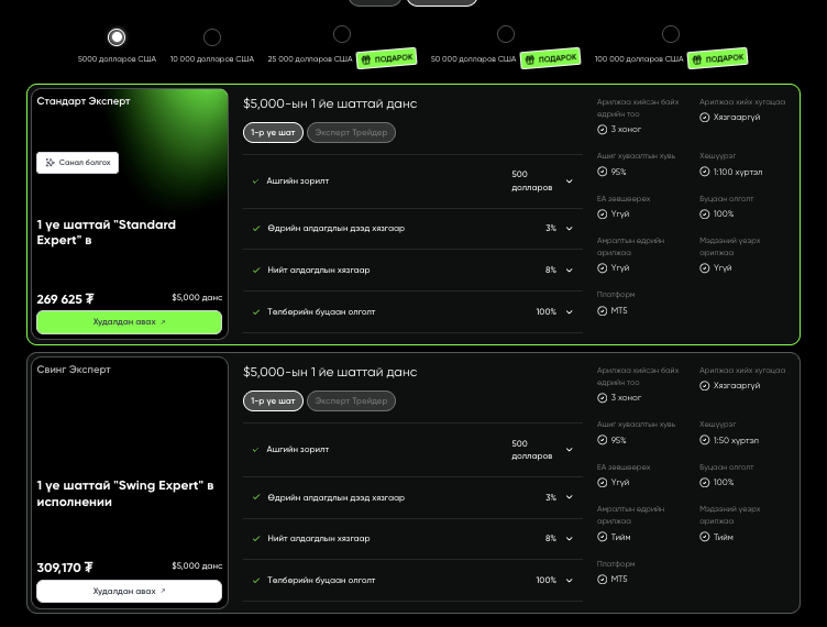 Номиналы: $5k / $10k / $25k / $50k / $100k и выше (разная стоимость входа)